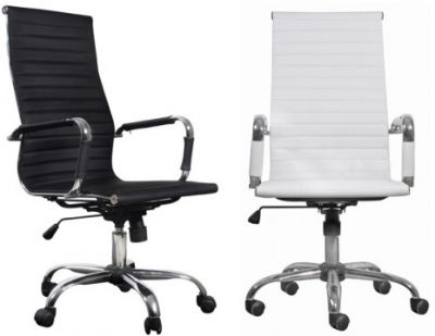 - Eames style Design Bureaustoel - Leer - kantoor, wit en zwart Prachtige Eames style bureau stoel. Het frame is gemaakt van verchroomd staal. De zwarte of witte bekleding is van splitleer ( sterk en duurzaam ). Laag model ( met lage rugleuning ): Euro 199,- per stuk Hoog model ( met hoge rugleuning ): Euro 229,- per stuk De zitting en de rugleuning van deze Retro design bureau stoel hebben een ergonomische vormgeving en kunnen beiden naar eigen wens worden versteld ( kantelmechanisme en gasdrukveersysteem) . De stoel is zeer geschikt voor zowel thuis gebruik als op kantoor of in een vergader ruimte. Zithoogte: 46 - 53 cm. Hoogte rugleuning: 90 - 97 cm. Hoogte armleuning: 64 - 71 cm. Breedte zitting: 50 cm. Diepte zitting: 52 cm. Belastbaar gewicht: 110 kg. GRATIS BEZORGING in geheel Nederland en Belgiƫ !
