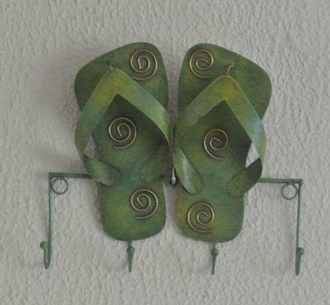 - Grappig metalen kapstokje met 4 haakjes, in de kapstok zitten 2 leuke sandalen verwerkt. Materiaal: Metaal Kleur: Groen Maat: Breedte ca 24cm Hoogte ca 22cm
